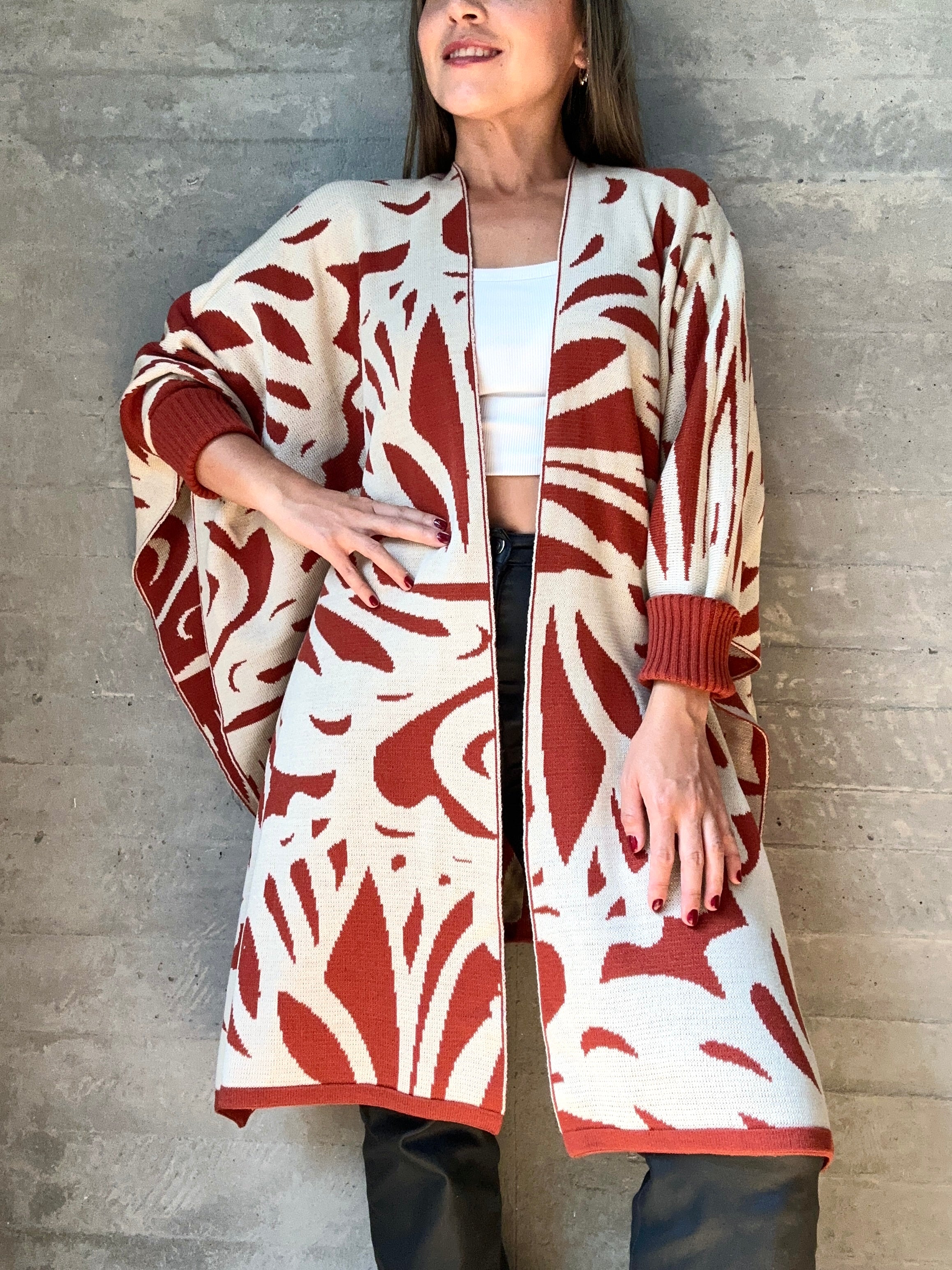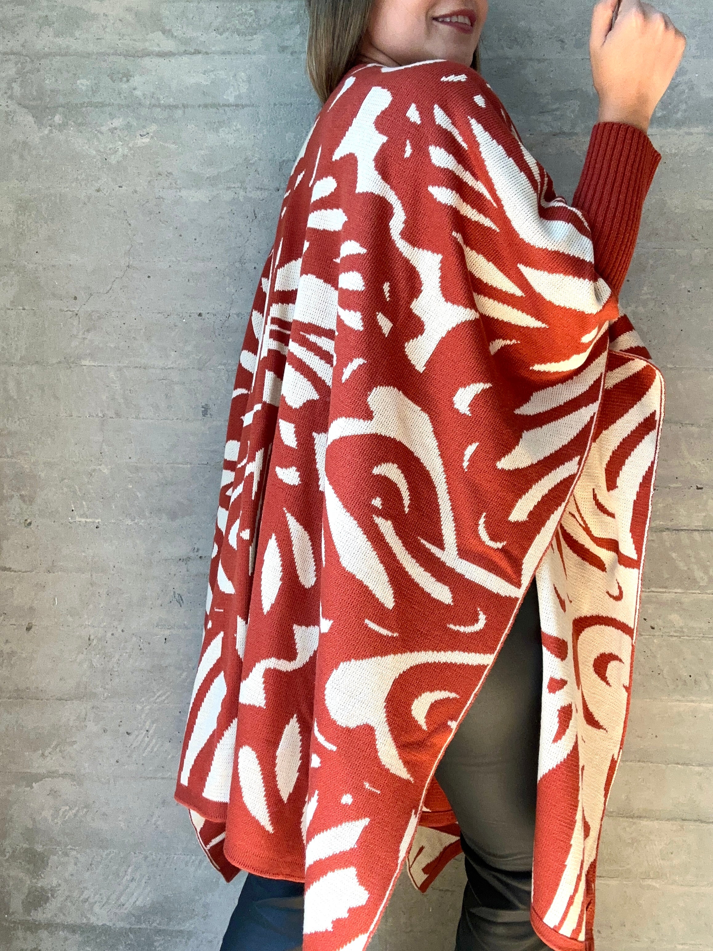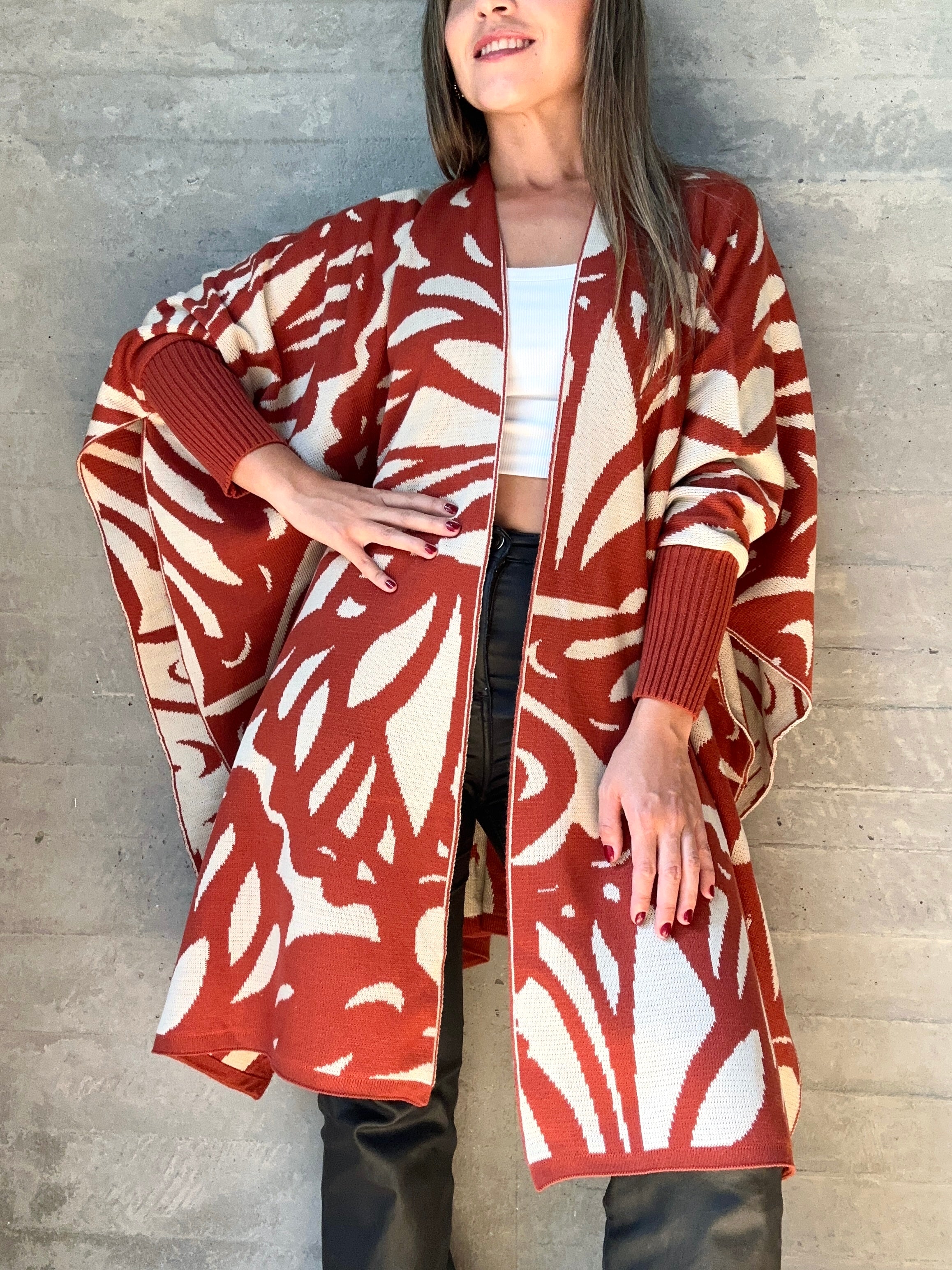 Capa con puño diseño alas de mariposa color terracota con beige, se puede usar doble faz doblando el puño