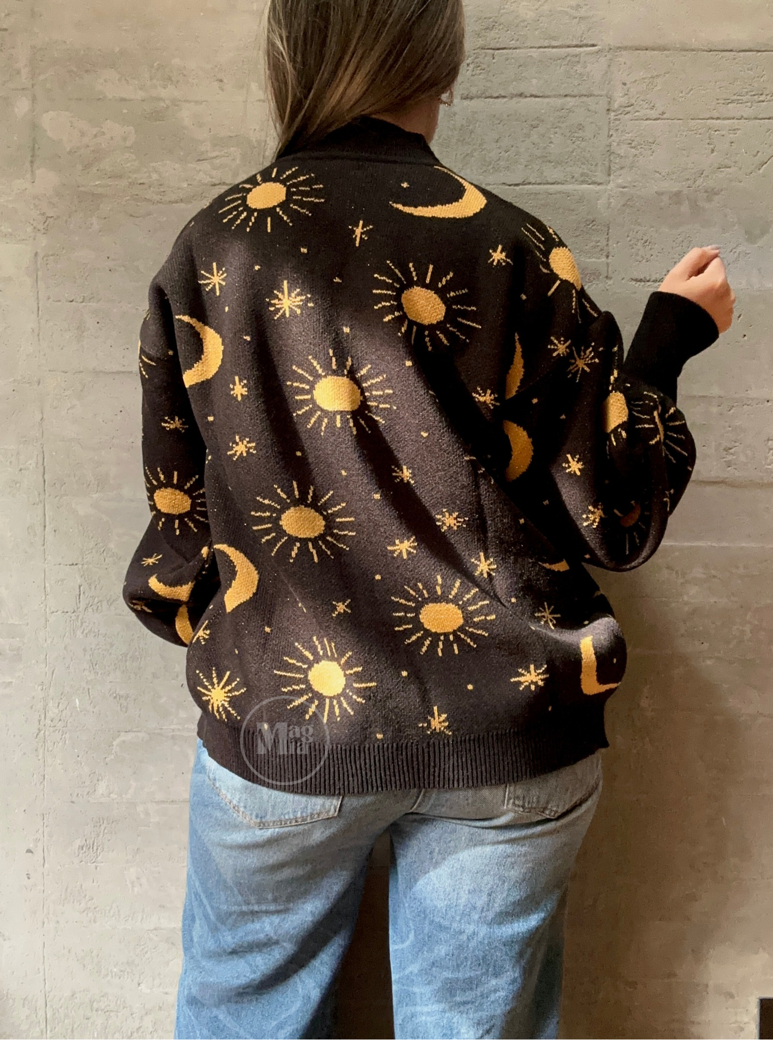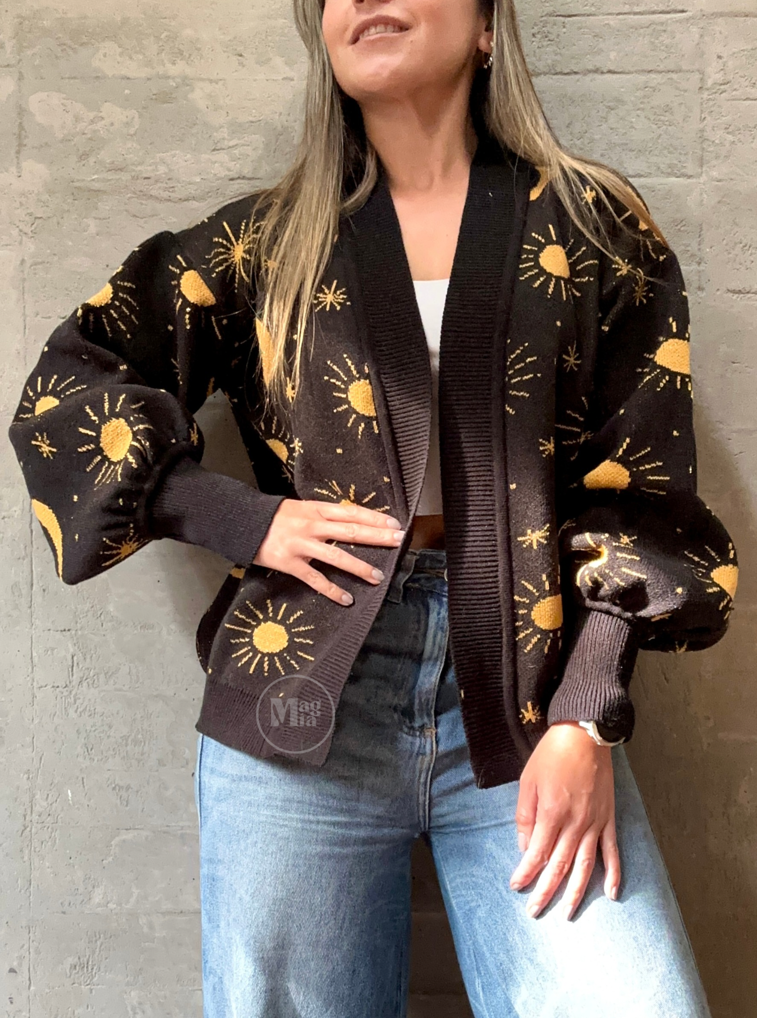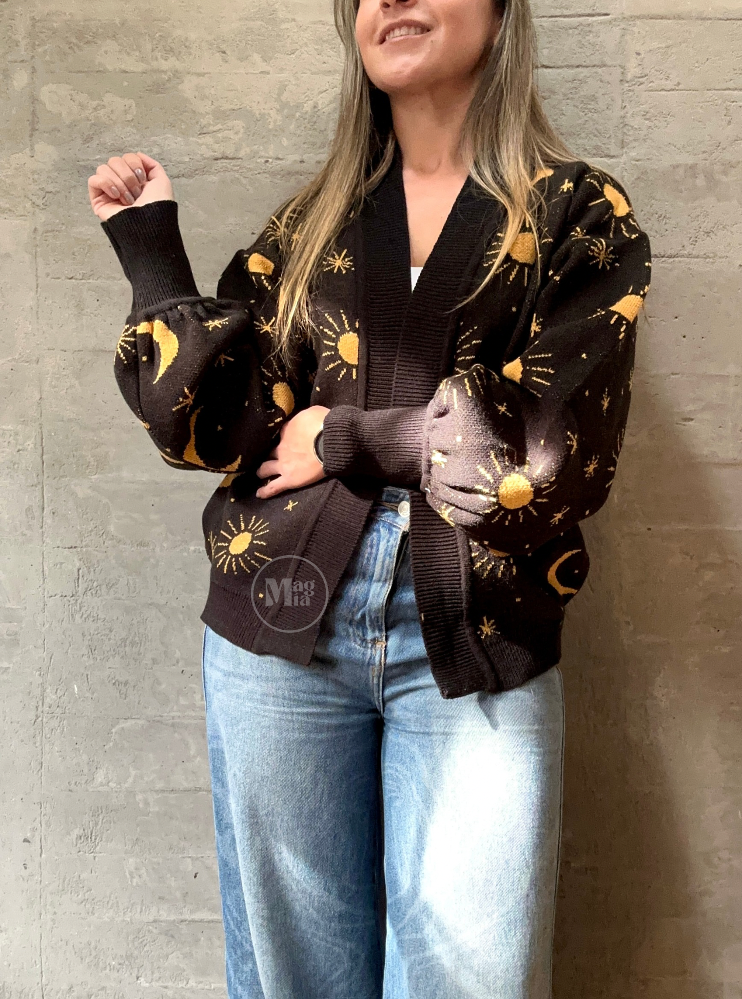 Lindo tejido tipo cárdigan abierto con diseño de sol y luna en lurex (hilo con visos brillantes) manga ancha con puños largos. color negro con dorado.