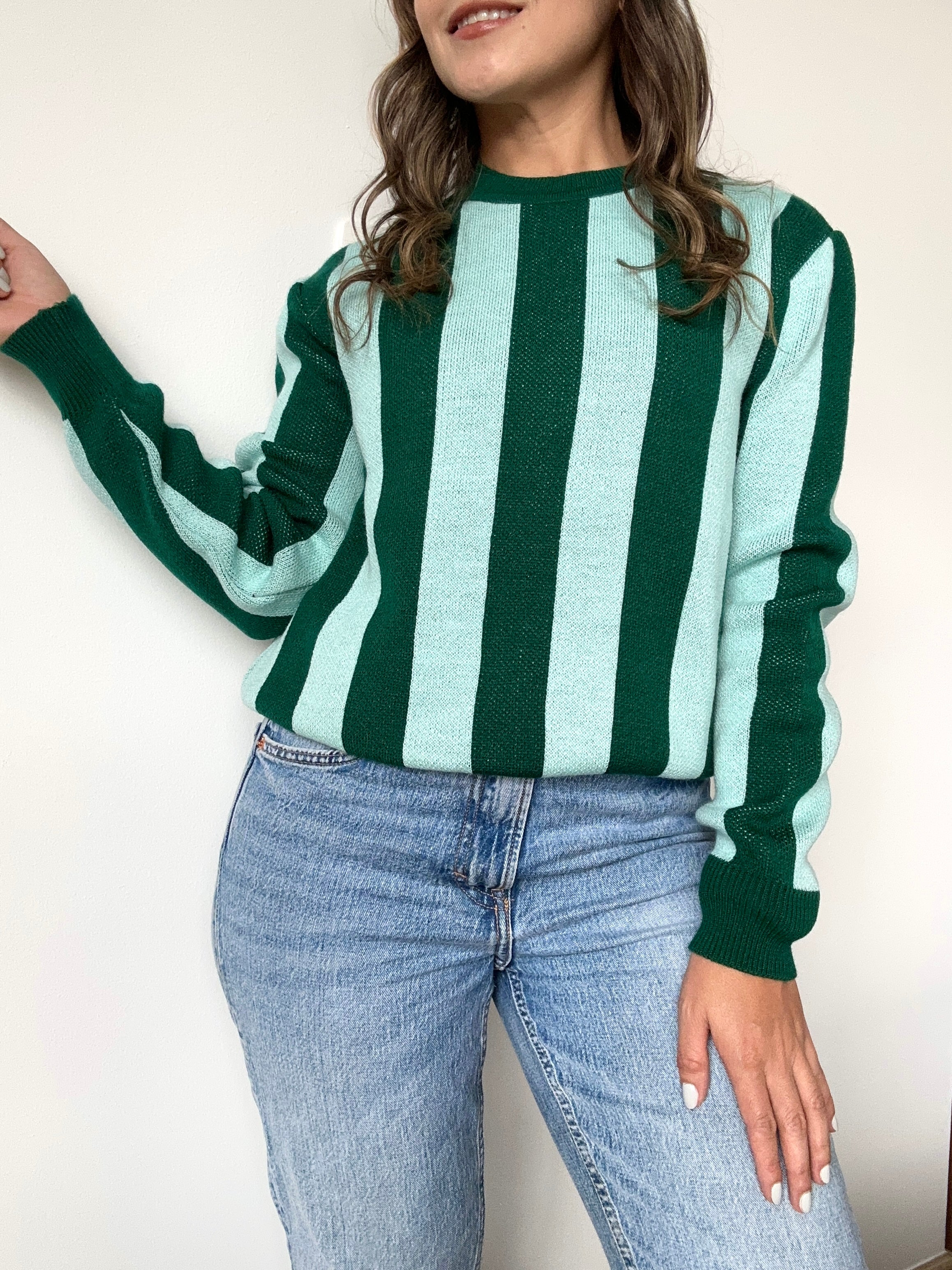 Lindo tejido en hilo, cuello redondo con diseño de líneas verticales, en colores que hacen el contraste perfecto para elevar tu look, color verde esmeralda con verde menta.